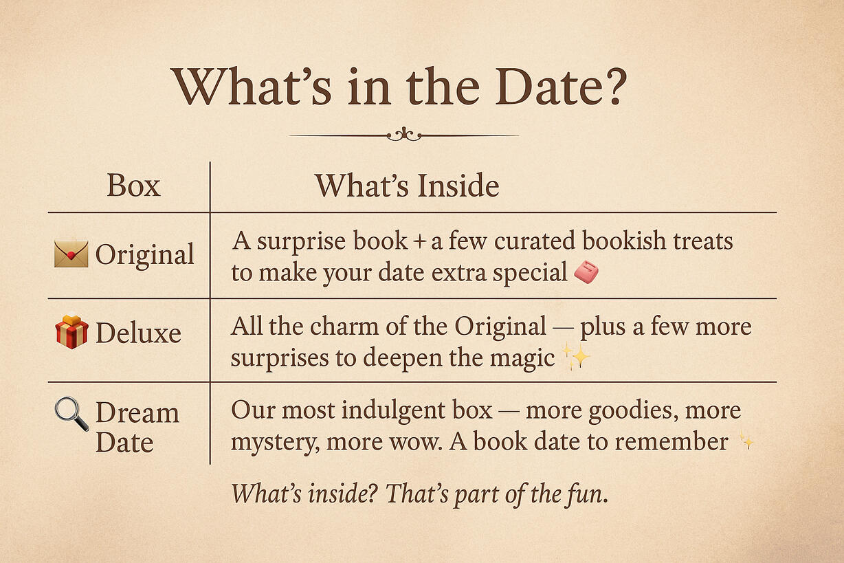 Each tier builds on the last. Original is sweet and simple. Deluxe adds a little extra charm. Dream Date? That’s full bookish indulgence. (You can peek at the comparison chart above — but not too hard! 😉)🎁 Can I choose the exact book?
